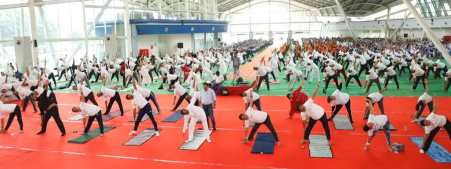 नवी मुंबई : ‘स्वच्छतेतून आरोग्य, आरोग्यासाठी योग' या सूत्रावर आधारित योगविषयक विशेष कार्यक्रमाचे आयोजन आंतरराष्ट्रीय योग दिनाचे औचित्य साधून नवी मुंबई महारपालिकेच्या वतीने सिडको आणि द आर्ट ऑफ लिव्हींग यांच्या सहयोगाने वाशी येथील सिडको प्रदर्शनी केंद्रात आयोजित करण्यात आले होते. अत्यंत भव्यतम स्वरूपात संपन्न झालेल्या या कार्यक्रमात विविध वयोगटातील ५ हजारहून नागरिकांनी सहभागी होत सदरचा उपक्रम यशस्वी केला.