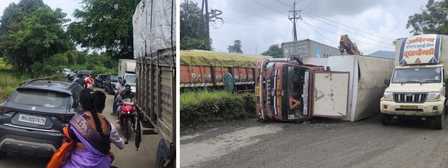 दरम्यान, याच रस्त्यावर भजनलाल डेरी फॉर्म ते सागपाडा हद्दीत ट्रक पलटी झाल्याची घटनाही ९ ऑगस्ट रोजी दुपारी घडली होती. त्यामुळे काही वेळासाठी चिंचोटी-अंजूर फाटा मार्गावरील वाहतूक ठप्प झाली होती. त्यानंतर दुपारनंतर काही प्रमाणात वाहतूक सुरळीत होण्यास सुरुवात झाली होती.