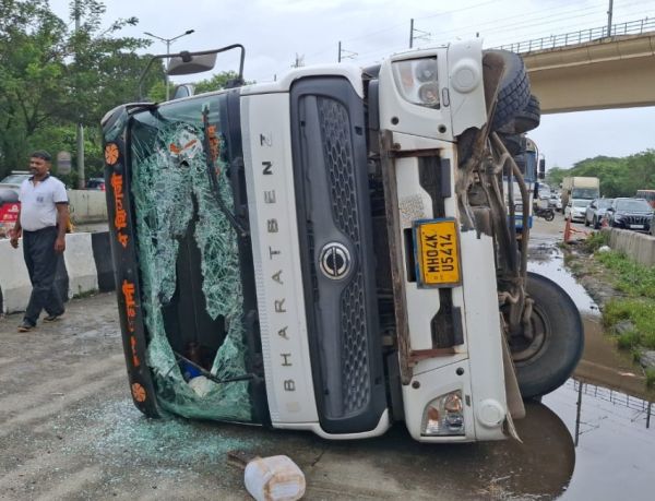 सीबीडी बेलापूर येथे ऑईल टँकर उलटला; सुदैवाने मोठी दुर्घटना टळली
