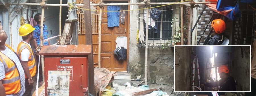 ठाणेः किसननगर येथील मस्जिद गल्लीत २ सप्टेंबर रोजी दुपारी तिवारी सदन या जुुन्या इमारतीचे दुरुस्तीचे काम चालू असतानाच अचानक या इमारतीच्या दुसऱ्या मजल्यावरील स्लॅबचा भाग कोसळल्याची घटना घडली. सुदैवाने यात कोणतीही जीवितहानी झाली नाही. या घटनेनंतर इमारत खाली करुन १७ रहिवाशांचे तात्पुरते स्थलांतर करण्यात आले.