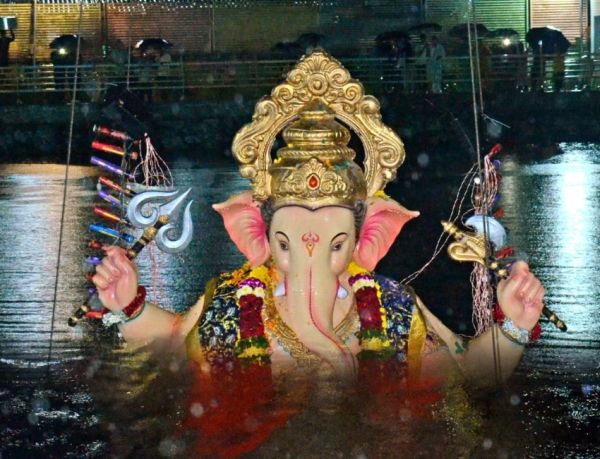 मुसळधार पावसातही विविध जाती धर्माचे हजारो गणेश भक्त मोठ्या भक्ती भावाने या विसर्जन मिरवणुकीत तहानभूक विसरुन सामील झाले होते.