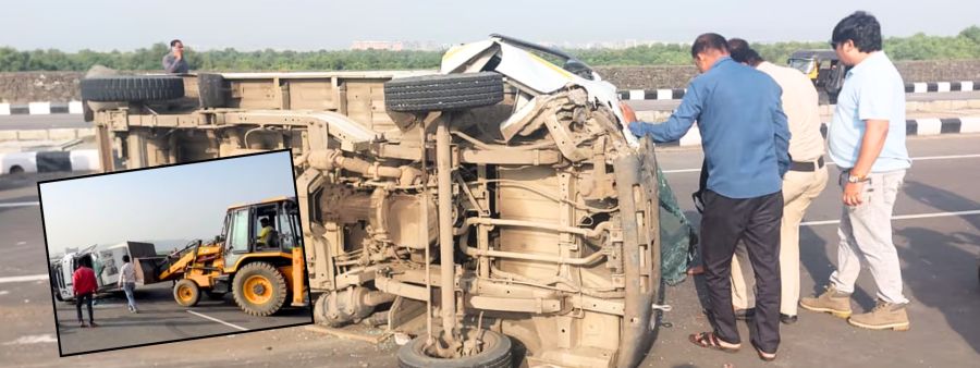 नवी मुंबई आंतरराष्ट्रीय विमानतळासमोरील रस्त्यावरील पहिल्या अपघातात तीन वाहनाचा भीषण अपघात