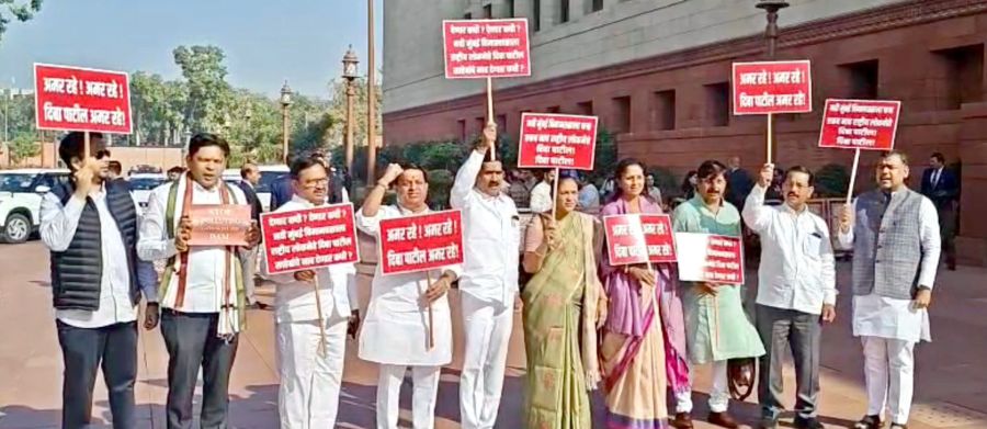 या निदर्शन आंदोलनात ‘राष्ट्रवादी शरदचंद्र पवार पक्ष'च्या खासदार सुप्रिया सुळे यांच्यासह ‘मविआ'चे खासदार सहभागी झाले होते. यावेळी लोकनेते दि. बा. पाटील यांच्या नावाची घोषणा देत त्यासंबंधी हातात आपल्या मागणीचे फलक घेऊन खासदारांनी आंदोलन केले. मागील ११ वर्षांपासून नवी मुंबई आंतरराष्ट्रीय विमानतळाला लोकनेते दि. बा. पाटील यांचे नाव देण्यात यावे, अशी मागणी स्थानिक भूमीपुत्रांच्या वतीने करण्यात येत आहे. मात्र, केंद्र सरकार त्याकडे जाणीवपूर्वक दुर्लक्ष करीत आहे. जोपर्यंत विमानतळाला ‘दिबां'चे नाव देणार नाही, तोपर्यंत विविध मार्गाने आंदोलन सुरुच राहणार अशी प्रतिक्रिया खा. सुरेश म्हात्रे यांनी दिली आहे.