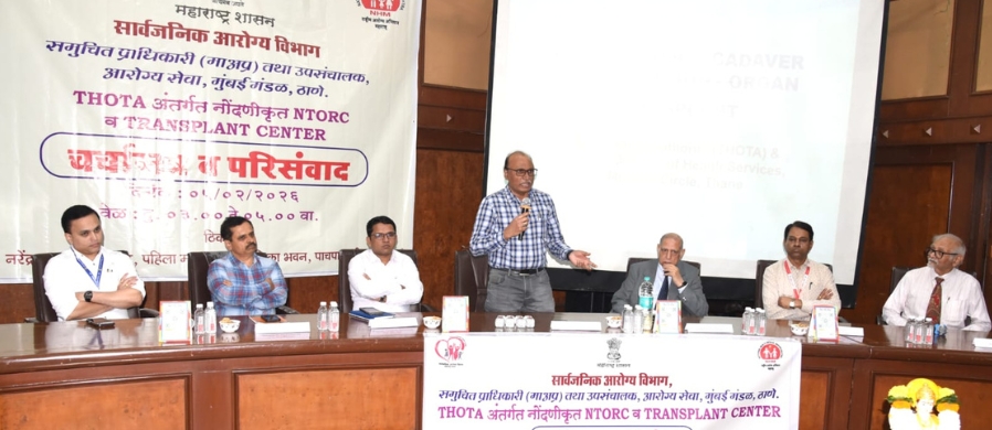 ठाणे : महाराष्ट्र शासनाच्या सार्वजनिक आरोग्य विभागांतर्गत समुचित प्राधिकारी (माअप्र) तथा उपसंचालक आरोग्य सेवा, मुंबई मंडळ, ठाणे यांच्यामार्फत अवयवदान या अत्यंत महत्त्वपूर्ण विषयावर चर्चासत्र आणि परिसंवादाचे आयोजन करण्यात आले होते. या चर्चासत्र आणि परिसंवादासाठी परिमंडळातील तिन्ही जिल्ह्यांमधील (ठाणे, रायगड, पालघर) जिल्हा शल्य चिकित्सक, जिल्हा आरोग्य अधिकारी, वैद्यकीय आरोग्य अधिकारी (महापालिका), वैद्यकीय अधीक्षक, नोंदणीकृत सर्व एनटीओआरसी आणि ट्रान्सप्लान्ट सेंटर, शासकीय रुग्णालये, वैद्यकीय महाविद्यालये आणिा इतर नामांकित खाजगी रुग्णालये येथील तज्ञ डॉक्टर आणी इतर वैद्यकीय अधिकारी-कर्मचारी मोठ्या संख्येने उपस्थित होते. या चर्चासत्र आणि परिसंवादामध्ये त्यांनी उत्स्फूर्तपणे सहभाग नोंदविला. अवयवदान-श्रेष्ठ दान असा संदेश अधोरेखित करणारा सदर कार्यक्रम आरोग्य सेवा, मुंबई मंडळ, ठाणे समुचित प्राधिकारी (माअप्र) तथा उपसंचालक डॉ. अशोक नांदापूरकर यांच्या अध्यक्षतेखाली यशस्वीपणे पार पडला.