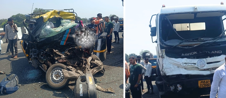 मुरबाडः १३ एप्रिल रोजी सकाळच्या सुमारास कल्याण-मुरबाड-माळशेज महामार्गावर रायते गावाच्या हद्दीत, पांजरपोळ गोशाळेजवळील उल्हास नदीवरील नवीन पुलावर अत्यंत हृदयद्रावक घटना घडली. कल्याणकडून प्रवासी घेऊन येणारी ओम्नी कार (काळी पिवळी) आणि अशोक लेलँड कंपनीचा मिक्सर यांची समोरासमोर धडक होऊन भीषण अपघात झाला. सदरची धडक इतकी भीषण होती की यात ओम्नी कारचा अक्षरशः चक्काचूर होत, त्यातील ११ प्रवाशांचा जागीच मृत्यू झाला आहे. मृतांमध्ये ८ पुरुष आणि ३ महिलांचा समावेश असून या घटनेमुळे संपूर्ण ठाणे जिल्ह्यावर शोककळा पसरली आहे.