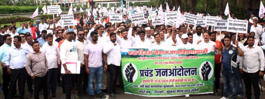 नवी मुंबई :- विकास आराखड्यातून खेळाचे मैदान रद्द करण्याच्या मागणी करीता जुईनगर आणि शिरवणे ग्रामस्थांनी मनपाच्या विरोधात 11जून रोजी धडक मोर्चा काढला होता. यावेळी मैदान बचवासाठी नवी मुंबईतील शेकडोहून अधिक ग्रामस्थ मोर्च्यात सामील झाले होते.