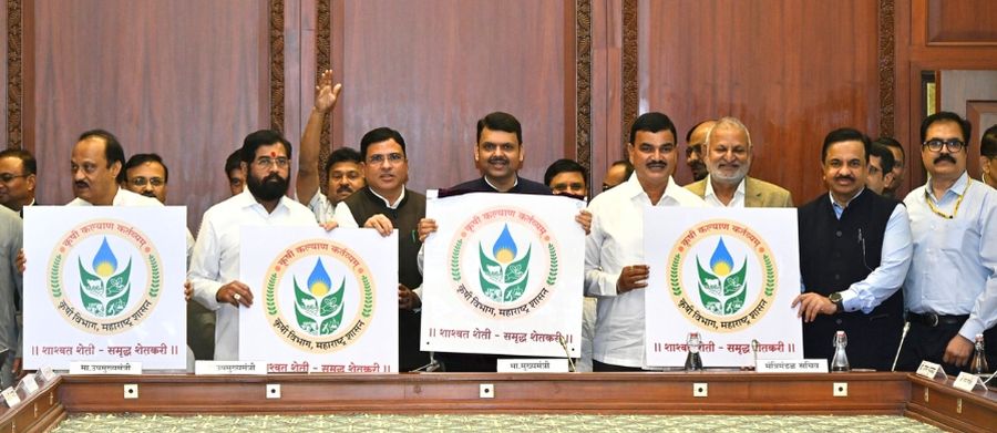 मुंबई : महाराष्ट्र राज्य कृषी विभागाच्या नवीन बोधचिन्हाचे तसेच ‘शाश्वत शेती-समृध्द शेतकरी' या नवीन घोषवाक्याचे अनावरण मुख्यमंत्री देवेंद्र फडणवीस यांनी ११ नोव्हेंबर रोजी सह्याद्री अतिथीगृह येथे उपमुख्यमंत्री एकनाथ शिंदे आणि उपमुख्यमंत्री अजित पवार, कृषी मंत्री दत्तात्रय भरणे यांच्या उपस्थितीत केले.