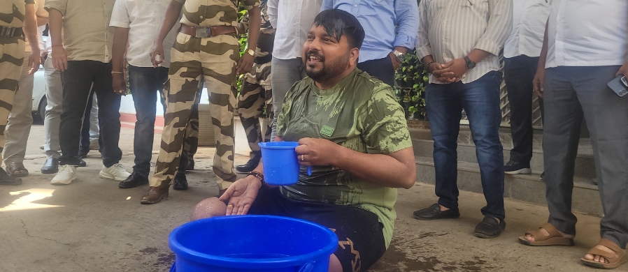 ठाणे : शहरातील वाढत्या पाणीटंचाईच्या विरोधात ‘राष्ट्रवादी काँग्रेस पक्ष-शरदचंद्र पवार पक्ष'चे नगरसेवक अभिजीत पवार यांनी ११ मार्च रोजी ठाणे महापालिका (टीएमसी) मुख्यालयात निदर्शने केली. आपल्या घरीही पाणीपुरवठा होत नसल्याचा आरोप करत पवार यांनी महापालिका आवारातील नळातून बादली भरली आणि पोर्च परिसरात आंघोळ केली. याद्वारे अभिजीत पवार यांनी नागरिकांसमोरील भीषण पाणीटंचाईकडे प्रशासनाचे लक्ष वेधले.