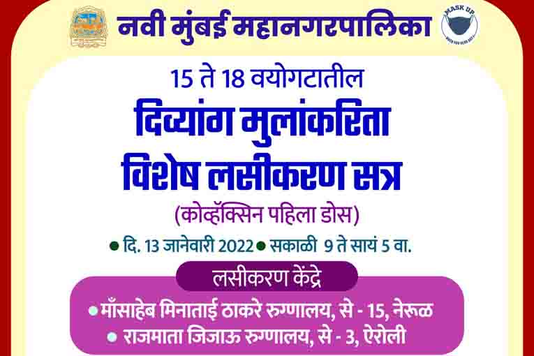 यामध्ये 15 ते 18 वयोगटातील दिव्यांग मुलांना सुलभतेने लसीकरण करून घेता यावे यादृष्टीने त्यांच्याकरिता 13 जानेवारी 2022 रोजी विशेष लसीकरण सत्र आयोजित करण्यात आले आहे. नवी मुंबई महानगरपालिकेचे सेक्टर 15, नेरूळ येथील माँसाहेब मिनाताई ठाकरे रूग्णालय आणि सेक्टर 3, ऐरोली येथील राजमाता जिजाऊ रूग्णालय याठिकाणी सकाळी 9 ते सायं. 5 या वेळेत या विशेष लसीकरण सत्राचे आयोजन करण्यात आलेले आहे.