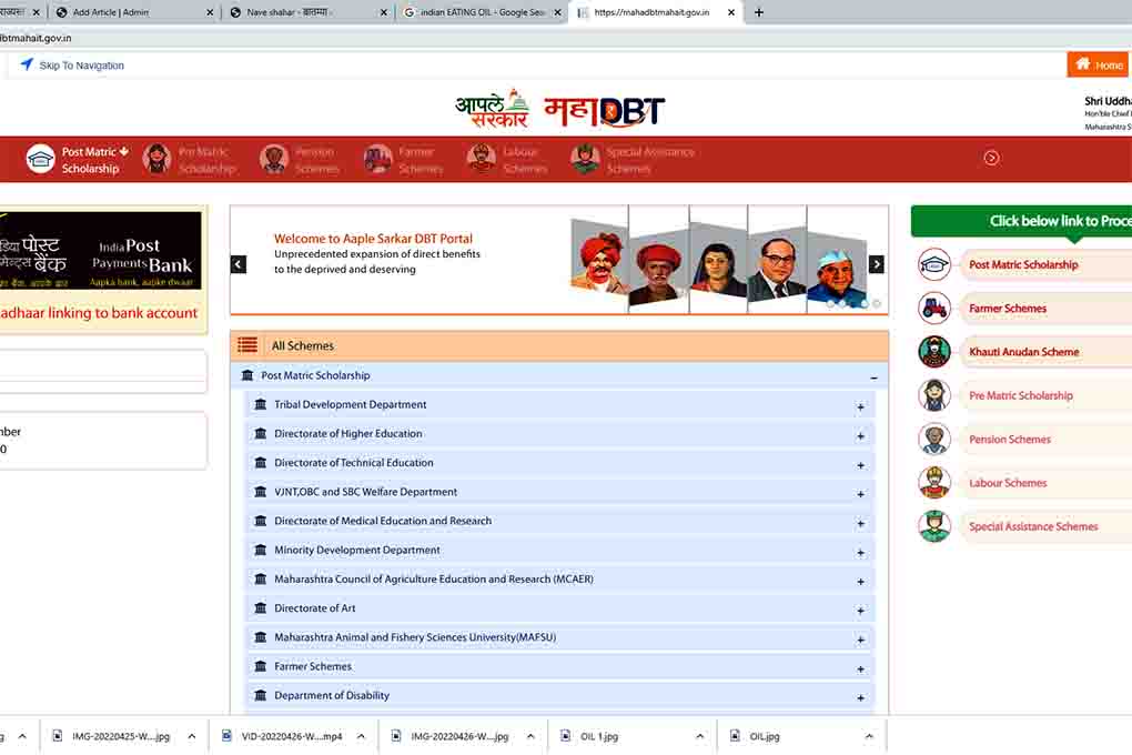 ठाणे : अनुसूचित जात प्रवर्गातील नवीन अर्ज भरणाऱ्या विद्यार्थांनी शिष्यवृत्तीसाठी 30 एप्रिल 2022 पर्यंत महाडीबीटी पोर्टलवर अर्ज करावेत. तसेच सन 2020-21 व 2021-22 या शैक्षणिक वर्षासाठी महाविद्यालयांनी सर्व प्रकारच्या शिष्यवृत्तीसाठीचे विद्यार्थ्यांचे अर्ज महाडीबीटी (MAHADBT) पोर्टलवर नोंदणी व तपासणी करुन समाज कल्याण विभागाच्या ठाणे सहायक आयुक्त कार्यालयाकडे यांच्याकडे सादर करावेत, असे आवाहन समाज कल्याण विभागाचे सहायक आयुक्त बलभीम शिंदे यांनी केले आहे.