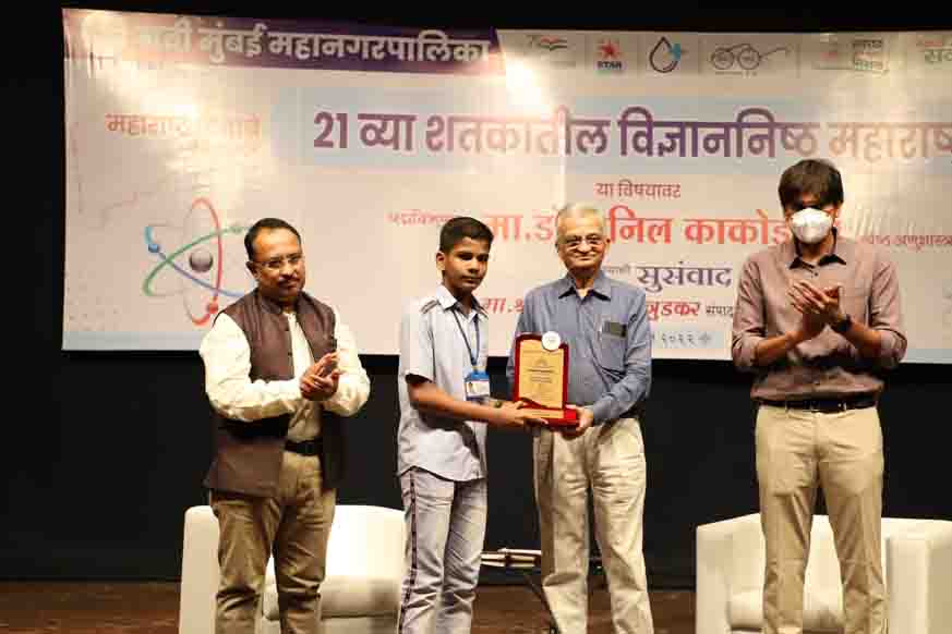 यावेळी डॉ. होमी भाभा बाल वैज्ञानिक परीक्षेत व्दितीय क्रमांकाचे रौप्यपदक व बाल वैज्ञानिक किताब मिळविणा-या नमुंमपा शाळा क्र. 31, कोपरखैरणेचा विद्यार्थी अथर्व महेंद्र मोरे याचा अनिल काकोडकर यांच्या शुभहस्ते, महापालिका आयुक्त अभिजीत बांगर यांच्या उपस्थितीत विशेष सन्मान करण्यात आला. त्याचप्रमाणे परीक्षेत मानांकन मिळविणारे नवी मुंबई महानगरपालिकेच्या विविध शाळांतील विद्यार्थी वैदेही नवले, दिप्ती पाटील, अर्चना यादव, गणेश प्रसाद, नीतू यादव, सुमित चव्हाण, स्वदिप बनसोडे, गायत्री योगी, रितेश वाघमोडे, केदार भोसले या विद्यार्थ्यांना सन्मानचिन्हे प्रदान करून सन्मानीत करण्यात आले.
