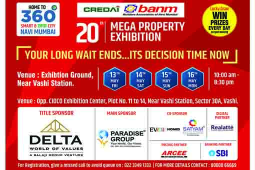 नवी मुंबई ः क्रेडाई आणि बिल्डर असोसिएशन ऑफ नवी मुंबई (बीएएनएम) यांच्या वतीने २० वे मेगा प्रॉपर्टी प्रदर्शन १३ ते १६ मे २०२२ या कालावधीत भरविण्यात येणार आहे. हे प्रॉपर्टी प्रदर्शन वाशी रेल्वे स्थानक जवळील सिडको एविझबिशन सेंंटरच्या बाजुला असणाऱ्या महभूखंड क्रमांक-११ ते १४ वर भरविले जाणार आहे.