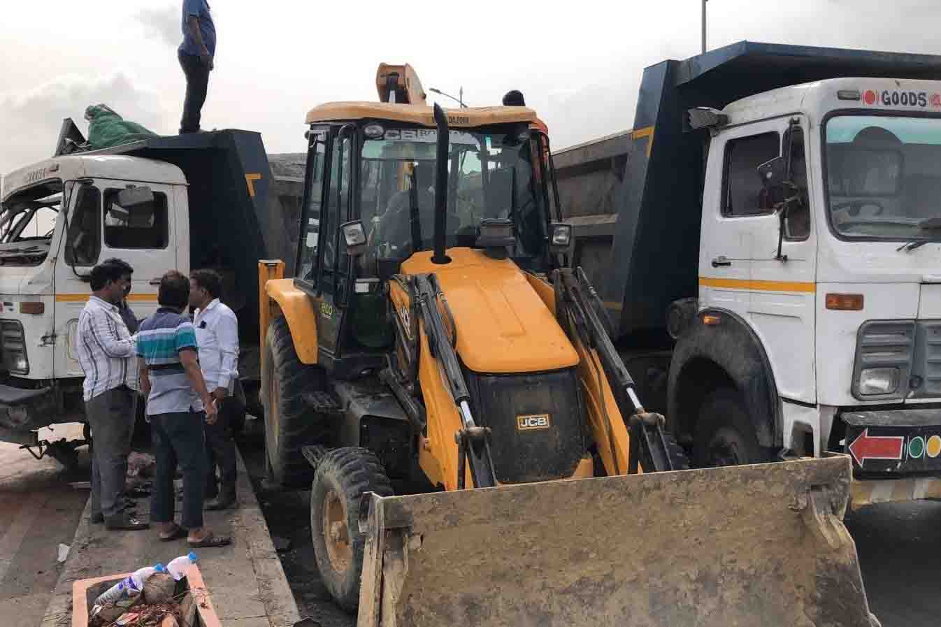 या घटनेतील अपघातग्रस्त डंपर शुक्रवारी सकाळी 5 वाजण्याच्या सुमारास खडीचा भुगा घेऊन वाशीहून मुंबईच्या दिशेने जात होता. सदर डंपर वाशी खाडी पुलावर आला असताना डंपर चालकाचा डोळा लागल्याने त्याचे डंपरवरील नियंत्रण सुटले. त्यामुळे सदर डंपर खाडी पुलावरील रस्ता दुभाजक तोडून दोन्ही रस्त्याच्या मधोमध आडवा झाला. डंपरचा अर्धा भाग मुंबई लेनवर, तर अर्धा भाग पुणे लेनवर अशा स्थितीत उभा राहिल्याने डंपर मधील खडीचा भुगा संपूर्ण रस्त्यावर खाली पडला त्यामुळे दोन्ही बाजूकडील रस्ता अडवला जाऊन दोन्ही बाजूकडील वाहतूक ठप्प झाली. या अपघातात डंपर चालक किरकोळ जखमी झाल्याने तो घटनास्थळावरून निघून गेला. त्यामुळे वाहतूक पोलिसांनी सकाळीच डंपर मालकाला संपर्क साधून त्याला पाचारण केले. त्यानंतर वाहतूक पोलिसांनी अपघातग्रस्त डंपर बाजूला काढण्याचा प्रयत्न सुरू केला.