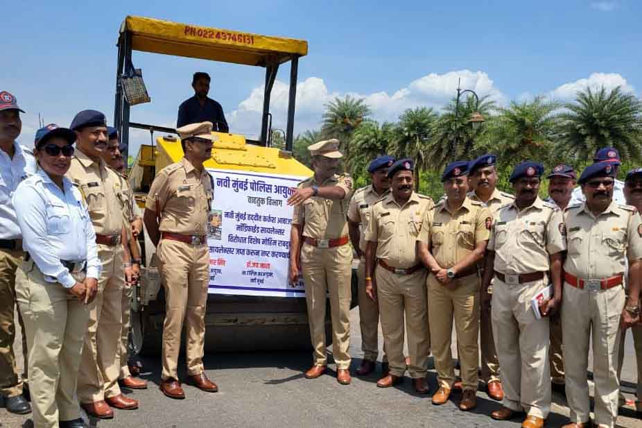 नवी मुंबई वाहतूक पोलिसांनी जप्त केलेल्या दुचाकीच्या 82 सायलेन्सर रोड रोलर चालवून केले नष्ट