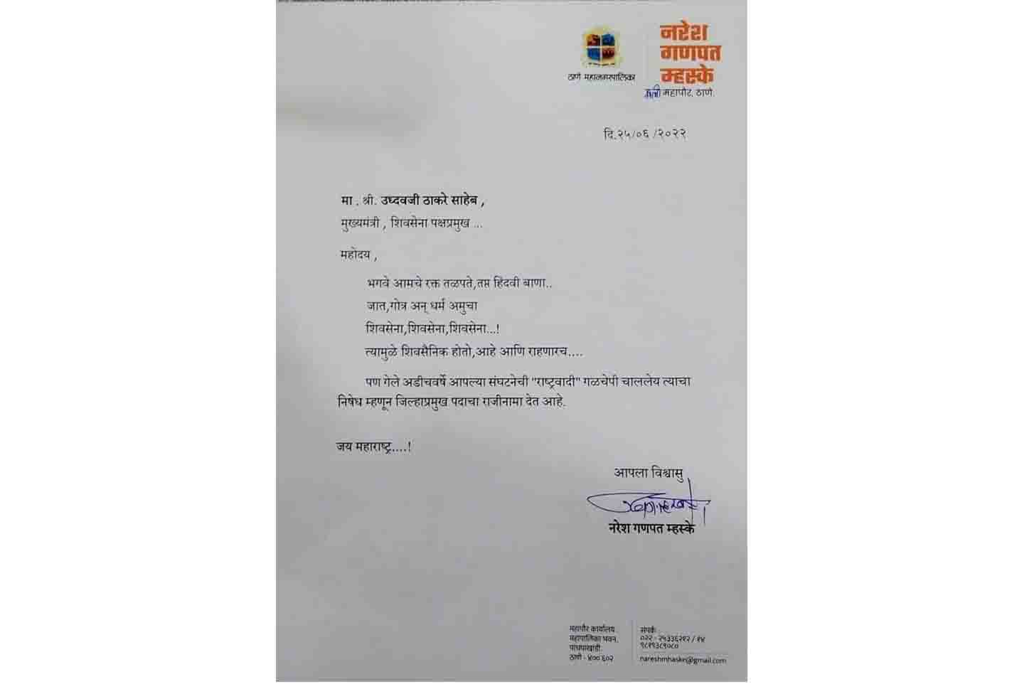 ठाणे महापालिकेचे माजी महापौर नरेश म्हस्के यांनी शिवसेना पक्षप्रमुख तथा महाराष्ट्राचे मुख्यमंत्री उध्दव ठाकरे यांना २५ जून २०२२ रोजी पत्र लिहून आपल्या ‘शिवसेना ठाणे जिल्हाप्रमुख' या पदाचा राजीनामा दिलेला आहे. मात्र, सदर राजीनाम्याचे पत्र पाठवताना नरेश म्हस्के यांनी आपल्या महापौर पदाच्या काळातील प्रशासकीय लेटरहेड वापरलेले आहे, जे बेकायदेशीर आहे. अशा प्रकारे ठाणे महापालिकेचे अधीकृत चिन्ह असलेले आणि ठाणे महापालिका मुख्यालयातील महापौर कार्यालयाचा स्पष्ट उल्लेख असलेले लेटरहेड आपल्या राजकीय पदाचा राजीनामा देण्यासाठी वापरणे म्हणजे महापालिका अधिनियमाचा भंग असून, यासंदर्भात ठाणे महापालिकेचे माजी महापौर नरेश म्हस्के यांच्यावर महापालिका अधिनियमानुसार, योग्य ती कायदेशीर कारवाई करण्यात यावी, अशी मागणी ठाणे मधील अजय जया यांनी ठाणे महापालिका आयुक्त तथा प्रशासक विपीन शर्मा यांच्याकडे ई-मेलद्वारे केली आहे.