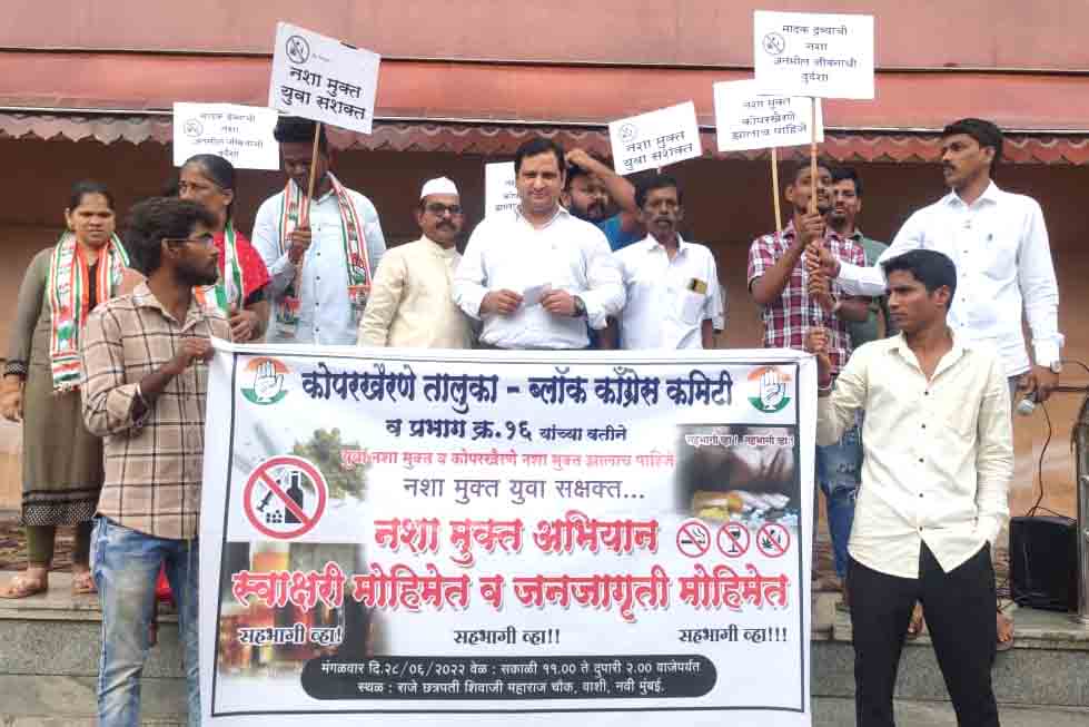 नवी मुंबई -: कोपरखैरणे विभागात मागील एक वर्षापासून अमली पदार्थांची खुलेआम विक्री होत असल्याने तरुणाई या अंमली पदार्थांच्या विळख्यात अडकत चालली आहे. तसेच या साऱ्या प्रकाराकडे पोलीस प्रशासनाचे दुर्लक्ष होत आहे. त्यामुळे कोपरखैरणे विभागाला नशा मुक्त करावे म्हणून नवी मुंबई काँग्रेसच्या वतीने मंगळवारी वाशीतील छत्रपती शिवाजी महाराज चौकात आंदोलन केले.