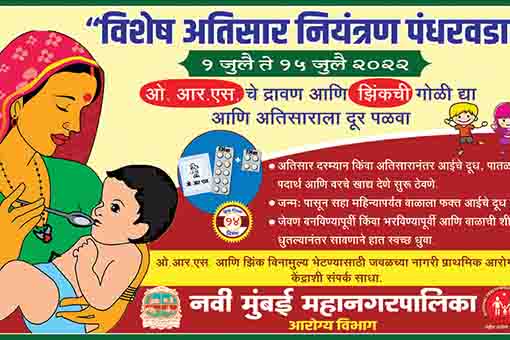 नवी मुंबई: केंद्र व राज्य शासनाच्या मार्गदर्शक सूचनेनुसार नवी मुंबई महानगरपालिका कार्यक्षेत्रात 1 जुलै ते 15 जुलै 2022 या कालावधीत “अतिसार नियंत्रण पंधरवडा मोहीम” राबविण्यात येत आहे. या मोहिमेमध्ये 0 ते 5 वर्ष वयोगटातील लाभार्थींना ओआरएस पाकीटांचे व झिंकचे वितरण करण्यात येत असून योग्य नियोजन करुन त्याचे प्राथमिक नागरी आरोग्य केंद्रनिहाय वितरण करण्यात येणार आहे.