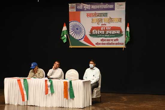 नवी मुंबई ः ‘हर घर तिरंगा' उपक्रमाच्या यशस्वी अंमलबजावणी करिता नवी मुंबई महापालिकाच्या वतीने विविध स्तरांतून प्रयत्न करण्यात येत असून या अनुषंगाने विष्णुदास भावे नाट्यगृहात महिला बचत गट आणि संस्था यांची २० जुलै रोजी कार्यशाळा आयोजित करण्यात आली होती. याप्रसंगी अतिरिवत महापालिका आयुवत सुजाता ढोले, प्रशासन विभागाचे उपआयुक्त जयदीप पवार, समाज विकास विभागाचे उपआयुक्त दादासाहेब चाबुकस्वार, सहाय्यक आयुक्त संजय तायडे, वाशी विभागाचे सहाय्यक आयुक्त सुखदेव येडवे, समाजविकास अधिकारी सर्जैराव परांडे, आदि उपस्थित होते.