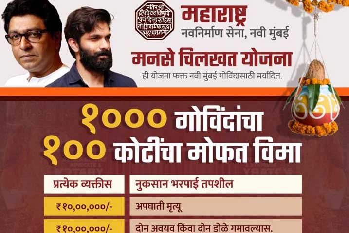 योजनेनुसार गोविंदास अपघाती मृत्यू आल्यास त्याच्या कुटुंबियांना १० लाख रुपये, कायम स्वरुपी अपंगत्व आल्यास १० लाख रुपये, अपघातामुळे रुग्णालयातील खर्च १ लाख रुपये असे विमा सुरक्षा कवच ‘मनसे'च्या वतीने मिळणार आहे. या योजनेचा नवी मुंबईतील गोविंदांनी जास्तीत जास्त लाभ घ्यावा, असे आवाहन नवी मुंबई शहर अध्यक्ष गजानन काळे यांनी केले आहे.
