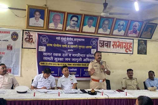 तसेच मासेमारी करीत असताना नियमितपणे बोटींची मुळ कागदपत्रे व बोटीवर असलेल्या प्रत्येकाकडे फोटो, आयडी कार्ड जवळ बाळगावे. समुद्रात कोणत्याही प्रकारची अनोळखी बोट आढळुन आल्यास तात्काळ दुरध्वनी क्रमांक 22751026/1022/1031 वर तसेच एम.आर.सी.सी. टोल फ्री क्रं.1554, ओएनजीसी हेल्पलाईन 1800221956 वर संपर्क साधण्याचे आवाहन केले. यावेळी सागरी सुरक्षा शाखेचे वरिष्ठ पोलीस निरीक्षक श्रीकांत धरणे यांनी देखील सागर रक्षक दल, ग्रामरक्षक दल, मच्छिमार बांधवांनी सागरी सुरक्षेच्या संदर्भात सतर्क राहुन सागरी-खाडी किनारीभागात संशयास्पद हालचालींची माहिती तात्काळ नजीकच्या पोलीस ठाण्यात अथवा नवी मुंबई पोलीस आयुक्तालयातर्फे सागरी सुरक्षेसंदर्भात सुरु करण्यात आलेल्या कोस्टल हेल्पलाईनवर (1093) देण्याचे आवाहन केले.