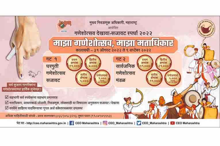 दरवर्षी भाद्रपद महिन्यातील गणेश चतुर्थी दिनी महाराष्ट्रातील गणेश भक्तांच्या तसेच सार्वजनिक गणेशोत्सव मंडळांच्या गणेशाचे आगमन होते अन् वातावरण चैतन्याने भरुन जाते. स्वातंत्र्यपूर्व काळात समाज प्रबोधनासाठी सुरु केलेली सार्वजनिक गणेशोत्सवाची परंपरा महाराष्ट्र आजही त्याच हिरिरीने जपतो आहे. याच प्रयत्नाचा एक भाग म्हणून महाराष्ट्र राज्य मुख्य निवडणूक अधिकारी कार्यालयाने 'माझा गणेशोत्सव माझा मताधिकार' या विषयासंबंधी गणेशोत्सव देखावा सजावट स्पर्धा आयोजित केली आहे. सार्वजनिक मंडळ तसेच घरगुती गणेशाची स्थापना करण्यात येते. यावेळी करण्यात येणाऱ्या सजावटीमध्ये मताधिकार १८ वर्षावरील नागरिकाचा कायदेशीर अधिकार आहे. त्यासाठी प्रत्येक नागरिकाने आपले नाव मतदार यादीत नोंदवणे आणि मताधिकार बजावणे, मतदार यादीतील दुबार नावे वगळण्यासाठी मतदार ओळखपत्राला आधार कार्ड जोडणे, असे सूत्र केंद्रस्थानी ठेवून मंडळांनी देखाव्याच्या माध्यमातून तर घरगुती पातळीवर गणेश-मखराची सजावट, गणेश दर्शनासाठी घरी येणाऱ्या भाविकांमध्ये यासंबंधीची जागरुकता करण्यासाठी अभिनव कल्पना राबविता येतील. तसेच मताधिकार बजावताना जात, धर्म, पंथ निरपेक्ष राहून लोकप्रतिनिधी निवडणे, पैसे किंवा इतर आमिषांना बळी न पडता मताधिकार बजावणे, यासारख्या विषयावर देखावा, सजावटीतून जागृती करता येऊ शकते. या देखाव्याची छायाचित्रे, ध्वनिचित्रफित ‘माझा गणेशोत्सव, माझा मताधिकार' या स्पर्धेसाठी पाठविता येणार आहे. यासंदर्भात मुख्य निवडणूक अधिकारी कार्यालयाच्या प्ूूज्ेः//मद.स्ीप्ीीीेप्ूीी.ुदन्.ग्ह या संकेतस्थळावर आणि समाजमाध्यमांवर या स्पर्धेची सविस्तर नियमावली देण्यात आलेली आहे. स्पर्धेत सहभागी घ्ोण्यासाठी गणेशोत्सव मंडळांनी आणि घरगुती गणेशोत्सव सजावटीच्या स्पर्धकांनी ३१ ऑगस्ट ते ९ सप्टेंबर २०२२ या कालावधीत प्ूूज्ेः//दिीस्े.ुत या गूगल फॉर्मद्वारे माहिती भरणे आवश्यक आहे.