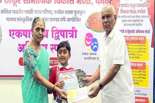 पनवेल: श्री. रामशेठ ठाकूर सामाजिक विकास मंडळ पनवेल आणि अखिल भारतीय मराठी नाट्य परिषद पनवेल शाखा पुरस्कृत भाजप सांस्कृतिक सेल उत्तर रायगडच्या वतीने आयोजित करण्यात आलेल्या एकपात्री स्पर्धेत ख़ुशी चौधरी, तृषान्तु बोबडे तर द्विपात्री राज्यस्तरीय अभिनय स्पर्धेत उमेश वाळके व प्रतिकेश मोरे यांनी प्रथम क्रमांक पटकाविला.
