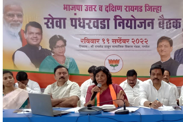 सेवा पंधरवडा अनुषंगाने उत्तर व दक्षिण रायगड जिल्ह्याची नियोजन बैठक विजया रहाटकर यांच्या मार्गदशनाखाली आणि आमदार महेश बालदी यांच्या प्रमुख उपस्थितीत मार्केट यार्ड मधील श्री रामशेठ ठाकूर सामाजिक विकास मंडळाच्या सभागृहात पार पडली. या बैठकीस भाजपचे रायगड जिल्हाध्यक्ष आमदार प्रशांत ठाकूर यांनी ऑनलाईन पद्धतीने सहभाग घेऊन संवाद साधला. या बैठकीस भाजपचे प्रदेश कार्यकारिणी सदस्य बाळासाहेब पाटील, माजी महापौर कविता चौतमोल, भाजपचे तालुकाध्यक्ष अरुणशेठ भगत, शहराध्यक्ष जयंत पगडे, जिल्हा संघटन सरचिटणीस अविनाश कोळी, श्रीनंद पटवर्धन, माजी सभागृहनेते परेश ठाकूर, महिला मोर्चाच्या जिल्हाध्यक्षा आश्विनी पाटील, भाजपचे जिल्हा उपाध्यक्ष के. के. म्हात्रे, प्रल्हाद केणी, सुनिल घरत, निळकंठ घरत, सतीश धारप, रमेश मुंढे, दीपक बेहेरे, वैकुंठ पाटील, मिलिंद पाटील, राजेश मपारा, उरण तालुका अध्यक्ष रवी भोईर, शहर अध्यक्ष कौशिक शहा, कर्जत तालुकाध्यक्ष मंगेश म्हसकर, खालापूर तालुकाध्यक्ष रामदास ठोंबरे, खारघर अध्यक्ष ब्रिजेश पटेल, कळंबोली अध्यक्ष रविनाथ पाटील, महिला मोर्चा पनवेल तालुकाध्यक्षा रत्नप्रभा घरत, यांच्यासह विविध सेलचे पदाधिकारी, लोकप्रतिनिधी उपस्थित होते.