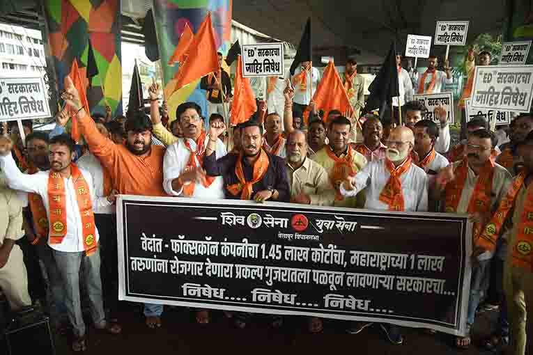 नवी मुंबई ः वेदांत-फॉवसकॉन कंपनीचा १.४५ लाख कोटींचा आणि महाराष्ट्र राज्यातील १ लाख तरुणांना रोजगार देणारा प्रकल्प राज्यातील शिंदे सरकारच्या उदासिनतेमुळे केंद्र सरकारने गुजरातला नेल्याचा आरोप करुन नवी मुंबई मधील शिवसेनाच्या पदाधिकाऱ्यांनी जिल्हाप्रमुख विठ्ठल मोरे यांच्या नेतृत्वाखाली राज्य सरकार विरोधात रणशिंग फुंकले. यावेळी शिवसैनिकांनी १५ सप्टेंबर रोजी ठाणे-बेलापूर रोडवरील तुर्भे उड्डाणपुलाजवळ आंदोलन केले.