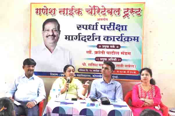 कोपरखैरणे ः कोपरखैरणे येथील एफ.जी. नाईक महावद्यिालयात १५ सप्टेंबर रोजी आ. गणेश नाईक यांच्या जन्मदनिाचे औचत्यि साधून मोफत स्पर्धा परीक्षा मार्गदर्शन केंद्राचे उद्घाटन करण्यात आले. त्या अनुषंगाने गणेश नाईक चॅरटिेबल ट्रस्टचे अध्यक्ष माननीय डॉ. संजीव नाईक, सचवि माननीय संदीप नाईक यांच्या मार्गदर्शना अंतर्गत सदर उपक्रमांचा शुभारंभ रवविार १८ सप्टेंबर रोजी प्रमुख अतथिी सौ.क्रांती पाटील अवर सचवि राजशष्टिाचार वभिाग यांच्या शुभहस्ते करण्यात आला.