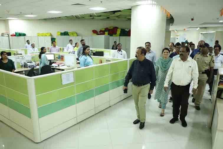मुख्यालयातील सीसीटिव्ही, वातानुकूलन यंत्रणा, सुरक्षा व्यवस्था यावर नियंत्रण ठेवणाऱ्या बीएमएस कंट्रोल रुमला भेट देत आयुक्त राजेश नार्वेकर यांनी तेथील यंत्रणेची बारकाईने माहिती जाणून घेतली. बेसमेंट मधील आपत्कालीन नियंत्रण कक्षाची पाहणी करत दक्षतेने कार्यरत राहण्याच्या सूचना त्यांनी केल्या. घनकचरा व्यवस्थापन विभागाच्या आरएफआयडी कन्ट्रोल रुमला भेट देत आयुक्तांनी कचरा वाहतूक वाहनांची ट्रॅकींग सिस्टीम जाणून घ्ोतली. तसेच त्यांच्या डिजीटल रिपोर्टस्ची आणि व्यवस्थापनाची पाहणी केली. तळमजल्यावरील आवक-जावक कक्षाची पाहणी करीत तेथील पत्रव्यवहाराची ट्रॅकींग सिस्टींम अधिक प्रभावी करण्यासाठी उपाययोजना करण्याचे निर्देशही आयुवत नार्वेकर यांनी अधिकाऱ्यांना दिले.