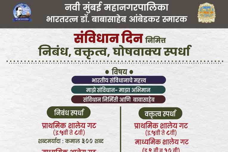 असाच एक अभिनव उपक्रम 26 नोव्हेंबर रोजीच्या संविधान दिनाचे औचित्य साधून राबविण्यात येत आहे. भारतीय संविधानातील मौलिक तत्वे, मूलभूत अधिकार आणि कर्तव्ये स्वतंत्र भारताच्या नागरिकांना संस्कारीत करणारी आहेत. यादृष्टीने भारतीय संविधानाविषयी विद्यार्थी आणि नागरिकांमध्ये जाणीव जागृती व्हावी याकरिता नवी मुंबई महानगरपालिकेच्या वतीने संविधान दिनानिमित्त ‘निबंध, वक्तृत्व व घोषवाक्य स्पर्धा’ आयोजित करण्यात येत आहे.