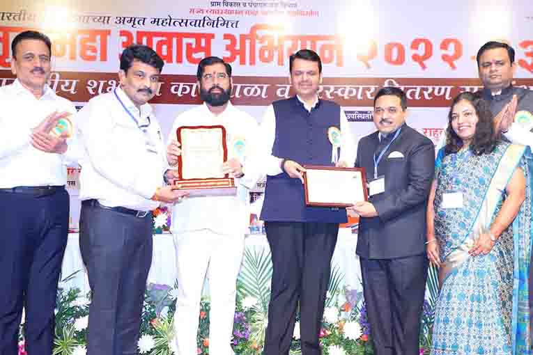 नवी मुंबई ः ‘महा आवास अभियान २०२०-२१'मध्ये राबविण्यात आलेल्या उपक्रमांपैकी केंद्र पुरस्कृत ‘प्रधानमंत्री आवास योजना-ग्रामीण या योजनेमध्ये सर्वोत्कृष्ट विभाग म्हणून कोकण विभागास प्रथम क्रमांकाने गौरविण्यात आले. तसेच राज्य पुरस्कृत आवास योजनेमध्ये सर्वोत्कृष्ट विभाग म्हणून कोकण विभागाने प्रथम क्रमांक पटकावला. कोकण विभागाच्या उल्लेखनीय कामामुळे विभागातील उत्कृष्ट काम करणाऱ्या संस्था आणि व्यक्तींना‘महा आवास अभियान पुरस्कार आणि महा आवास अभियान विशेष पुरस्काराने गौरविण्यात आले आहे. त्यानुसार मुख्यमंत्री ना.एकनाथ शिंदे यांच्या हस्ते कोकण विभागीय आयुक्त डॉ.महेंद्र कल्याणकर आणि उपायुक्त (विकास) गिरीश भालेराव यांना गौरविण्यात आले.
