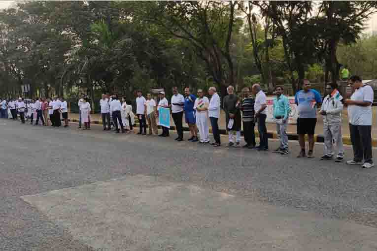 नवी मुंबई ः नवी मुंबई आंतरराष्ट्रीय विमानतळाच्या (एनएमआयए) बांधकामात मोठे डोंगर भुईसपाट करण्यासाठी केलेल्या स्फोटांच्या तीव्रतेविरोधात जवळपास ३५० लोकांनी ९०० मीटर लांब मौन मानवी साखळी तयार करुन आपला निषेध नोंदविला. यावेळी आंदोलनकर्त्या रहिवाशांनी सीबीडी-बेलापूर, सेक्टर-१५ मधील जॉगर्स ट्रॅकपासून हातात बॅनर धरुन ‘मानवी साखळी' केली होती. नवी मुंबई विमानतळ प्रकल्प ठिकाणी वारंवार होणाऱ्या स्फोटांच्या तीव्रतेमुळे सीबीडी-बेलापूर मधील इमारतींच्या भिंतींना पडणाऱ्या भेगा आणि खिळखिळ्या झालेल्या खिडक्यांच्या काचांमुळे त्रस्त असलेल्या रहिवाशांना भेडसावणाऱ्या समस्यांना ‘मानवी साखळी'द्वारे वाचा फोडली.
