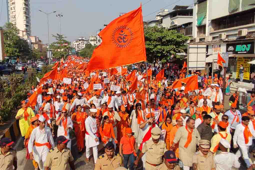 नवी मुंबई ः लव्ह जिहाद आणि धर्मांतर विरोधातील कायदा राज्यासह संपूर्ण देशात लागू करावा या मागणीसाठी ‘सकल हिंदू समाज'च्या वतीने २६ फेब्रुवारी रोजी वाशीत हिंदू जन आक्रोश मोर्चा काढण्यात आला होता. कोपरी नाका, सेक्टर-२८ येथील ब्लू डायमंड हॉटेल चौकातून या मोर्चाला सुरुवात झाली. भगवे झेंडे, भगव्या पताका हातात घेऊन हजारो नागरिक सहभागीझाले होते. सर्वांनी भगव्या टोप्या परिधान केल्या होत्या. त्यामुळे नवी मुंबईत भगवे वादळ अवतरले होते. युवा, महिला, विद्यार्थी, जेष्ठ, विविध हिंदू पंथ आणि संप्रदायाचे, हिंदू संघटनांचे प्रतिनिधी या मोर्चात सहभागी झाले होते. महिला भगिनींनी या मोर्चाचे नेतृत्व केले.