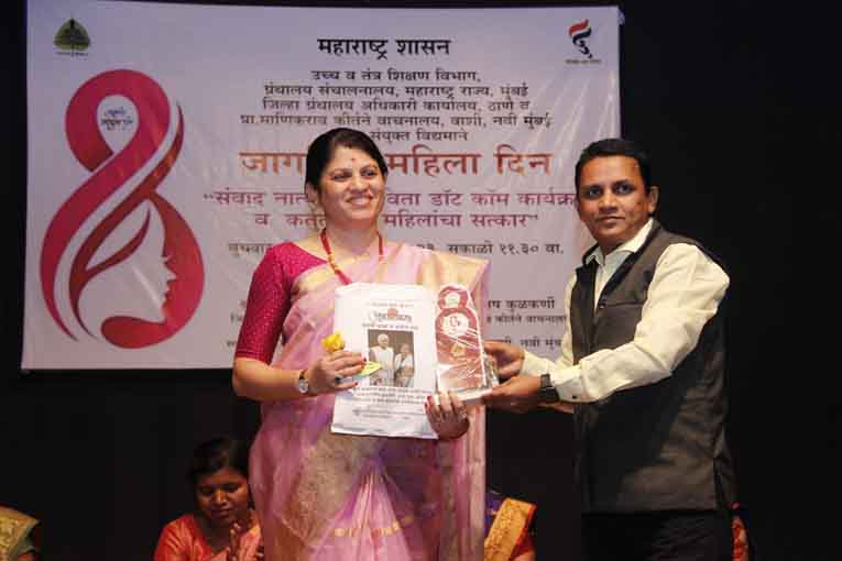 नवी मुंबई : महाराष्ट्र राज्य उच्च व तंत्र शिक्षण विभाग, ग्रंथालय संचालनालय, मुंबई जिल्हा ग्रंथालय अधिकारी कार्यालय ठाणे व प्रा.माणिकराव कीर्तने वाचनालय, वाशी, यांच्या संयुक्त विद्यमाने महिला दिनानिमित्त वाशीतील साहित्य मंदिर सभागृहात महिलांची जागृती व काव्य जागर कार्यक्रमाचे आयोजन करण्यात आले होते. यावेळी महिलांना फक्त शुभेच्छा न देता सर्वार्थाने महिलांमधील गुणवान, यशवंत, कर्तबगार महिलांचा कौतुक सोहळा देखील पार पडला.