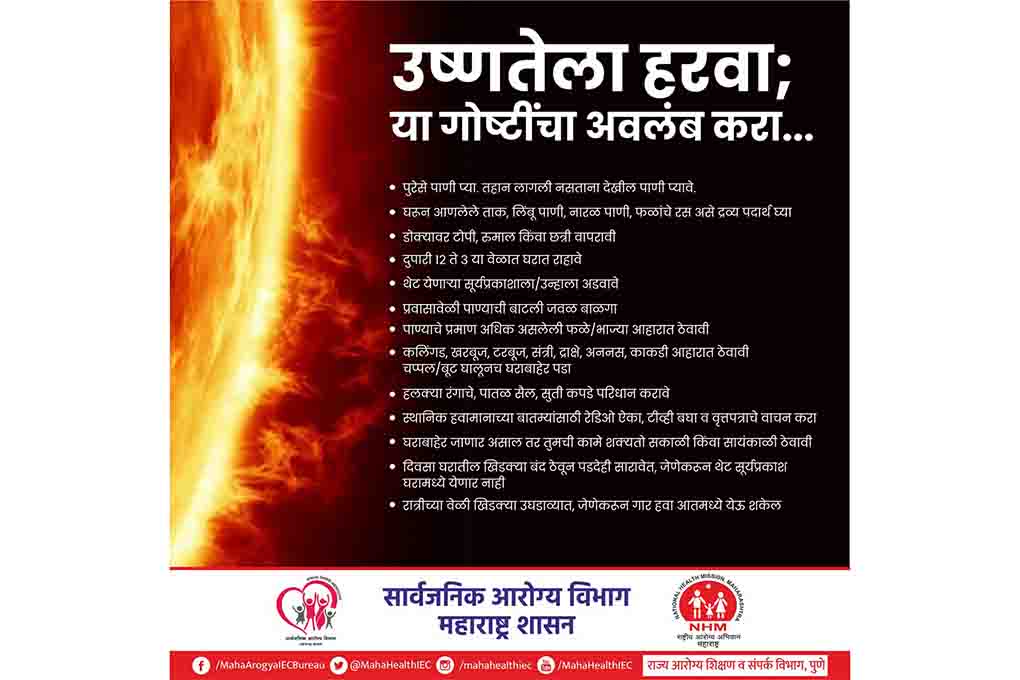 बाहेरचे तापमान प्रमाणाबाहेर वाढल्यानंतर शरीरातील तापमान नियंत्रित करण्याची यंत्रणा कोलमडते. उष्माघात झाल्यावर चक्कर येणे, मळमळ, उलट्या होणे, डोकेदुखी, दरदरुन घाम फुटणे, थकवा येणे, स्नायुंना आकडी येणे अशी लक्षणे दिसू लागताच जवळच्या आरोग्य केंद्राशी संपर्क करावा. उष्माघात होऊ नये म्हणून तहान लागलेली नसली तरीसुध्दा जास्तीत जास्त पाणी पिण्यात प्यावे. हलके, पातळ आणि सच्छिद्र सुती कपडे वापरावेत, बाहेर जातांना गॉगल्स, छत्री, टोपी, बुट आणि चप्पलचा वापर करण्यात यावा. प्रवास करताना पाण्याची बाटली सोबत ठेवावी.