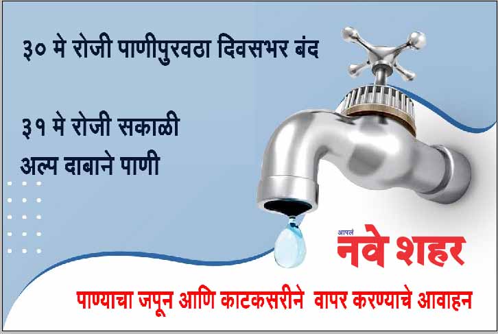 नवी मुंबई शहरात ३० मे रोजी दिवसभर पाणी पुरवठा बंद राहणार असल्याने नवी मुंबई महापालिका क्षेत्र तसेच कामोठे, खारघर नोड मधील नागरीकांनी आवश्यक पाण्याचा साठा करावा तसेच ३० मे ते ३१ मे या कालावधीत पाण्याचा जपून आणि काटकसरीने वापर करुन नवी मुंबई महापालिकेस सहकार्य करावे, असे आवाहन महापालिका द्वारे करण्यात आले आहे.