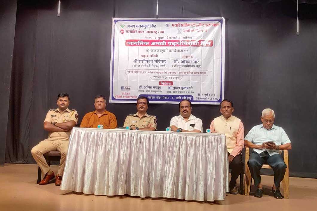 ‘जागतिक अंमली पदार्थ विरोधी दिन'चे औचित्य साधून ५ जुलै रोजी वाशीतील साहित्य मंदिर सभागृहात अन्वय व्यसनमुक्ती केंद्र, मराठी साहित्य संस्कृती-कला मंडळ तसेच नशाबंदी मंडळ महाराष्ट्र राज्य आणि अंमली पदार्थ विरोधी सेल यांच्या संयुक्त विद्यमाने विद्यार्थ्यांसाठी जनजागृती कार्यक्रमाचे आयोजन करण्यात आले होते. यावेळी प्रसिध्द मानसोपचार तज्ञ डॉ. आंेकार माटे संवादक म्हणून उपस्थित होते. यावेळी डॉ. माटे यांनी विद्यार्थ्यांशी संवाद साधला.