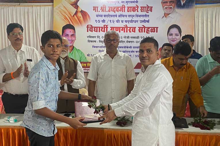 नवी मुंबई : ‘शिवसेना (उध्दव बाळासाहेब ठाकरे)'च्या सीवुडस् विभाग तर्फे पक्षप्रमुख तथा माजी मुख्यमंत्री उध्दव बाळासाहेब ठाकरे यांच्या वाढदिवसाचे औचित्य साधून इयत्ता दहावी आणि बारावी, पदवीधर उत्तीर्ण विद्यार्थी गुणगौरव सोहळा आयोजित करण्यात आला होता. याप्रसंगी ‘शिवसेना'चे जिल्हाप्रमुख विठ्ठल मोरे, उपजिल्हाप्रमुख संतोष घोसाळकर, सुमित्र कडू, उपशहरप्रमुख गणेश घाग, कौस्तुभ मोरे, विभागप्रमुख मिलिंद भोईर, अरुण गुरव, हरिश्चंद्र फल, माजी मुख्याध्यापक पांडुरंग केंगार, इंगावले काका, कार्यक्रमाचे आयोजक विभागप्रमुख विशाल विचारे, आदि उपस्थित होते.