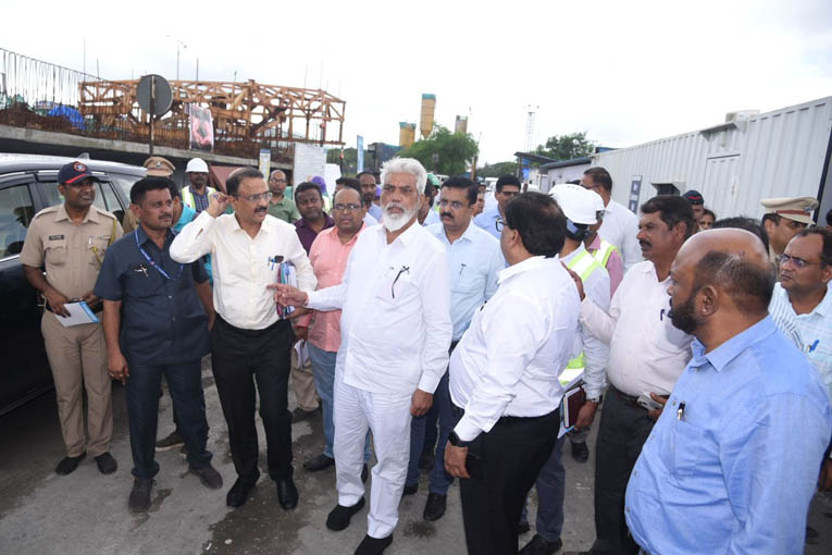 नवी मुंबई : सार्वजनिक बांधकाम मंत्री (सार्वजनिक उपक्रम) दादाजी भुसे यांनी वाशी येथील ठाणे खाडीपुलाच्या कामाची पाहणी करत सद्यस्थितीत सुरु असलेल्या कामांचा आढावा घेतला. दरम्यान, कामे वेळेत पूर्ण करण्यासंदर्भात ना. भुसे यांनी अधिकाऱ्यांना सूचना केल्या.