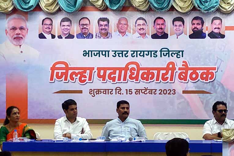 भाजप उत्तर रायगड जिल्हा कार्यकारिणीची बैठक आमदार प्रशांत ठाकूर, आमदार निरंजन डावखरे आणि उत्तर रायगड जिल्हाध्यक्ष अविनाश कोळी यांच्या प्रमुख उपस्थितीत शहरातील मार्केट यार्ड येथे ‘मेरी माटी मेरा देश', सेवा पंधरवडा, पदवीधर मतदार नोंदणी आणि सरल ॲप या विषयांच्या अनुषंगाने १५ सप्टेंबर रोजी पार पडली. त्यावेळी मार्गदर्शन करताना ते बोलत होते.