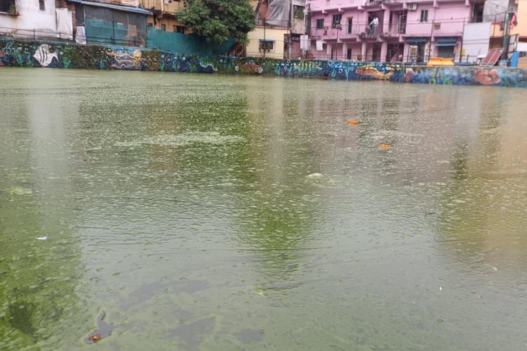 जुहुगावातील तलावात शेवाळ साचल्याने दुर्गंधी