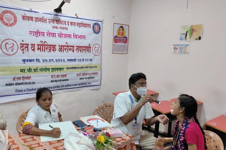 उरण : कोकण ज्ञानपीठ उरण वाणिज्य व कला महाविद्यालयातील राष्ट्रीय सेवा योजना विभागाच्या वतीने इंदिरा गांधी रुग्णालय उरण यांच्या सहकार्याने दंत व मौखिक आरोग्य तपासणी शिबिराचे आयोजन केले गेले. महाविद्यालयाचे प्राचार्य प्रा. डॉ. बळीराम एन.गायकवाड यांनी दाताचे आरोग्य अत्यंत महत्त्वाचे असून विद्यार्थ्यांनी दाताची काळजी घेतली पाहिजे असे सांगितले. डॉ. संतोष झापकर (दंतशल्य चिकित्सक, इंदिरा गांधी रुग्णालय उरण) यांनी दात घासण्याच्या पद्धती, तसेच दंत व मौखिक आरोग्य याची काळजी कशी घ्यावी याविषयी सविस्तर मार्गदर्शन केले व एकूण 62 विद्यार्थ्यांची दंत व मौखिक तपासणी करण्यात आले.तसेच त्यांचे योग्य समुपदेशन केले. यावेळी श्रीमती हिरा ठोंबरा यांनी सहकार्य केले. कार्यक्रमाचे सूत्रसंचालन व आभार राष्ट्रीय योजना प्रमुख डॉ. दत्ता हिंगमिरे यांनी केले. कार्यक्रमात आय.क्यु.ए.सी. समन्वयक डॉ. ए. आर. चव्हाण, डॉ.पराग कारुलकर, प्रा. व्हि. एस. इंदुलकर, डॉ. एच.के जगताप, प्रा. आनंद गायकवाड,डॉ. एम.जी.लोने, प्रा.रियाज पठाण,प्रा.विनिता तांडेल, प्रा.कु.हन्नत शेख आदी उपस्थित होते.