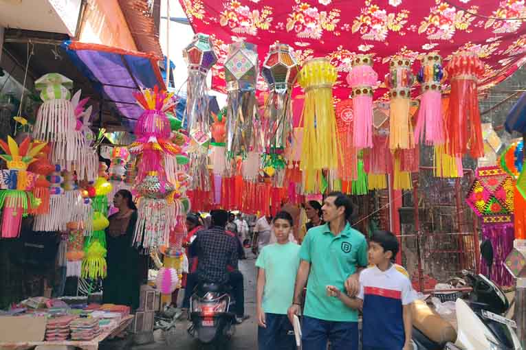 विविध आकाराचे, विविध प्रकारचे कंदील १०० रुपये पासून ५०० रुपये पर्यंत बाजारात उपलब्ध आहेत. मोती, कुंदन, कापडी फुलांचे तोरण, टिकाऊ फुलांची माळ, मेणाचे दिवे, लायटिंग, पणत्यांनी दुकाने बहरली आहेत. फटाक्यांची दुकाने सजली असली तरी किमती गेल्या वर्षीच्या तुलनेत २० ते ३० टक्क्यांनी वाढल्या आहेत.