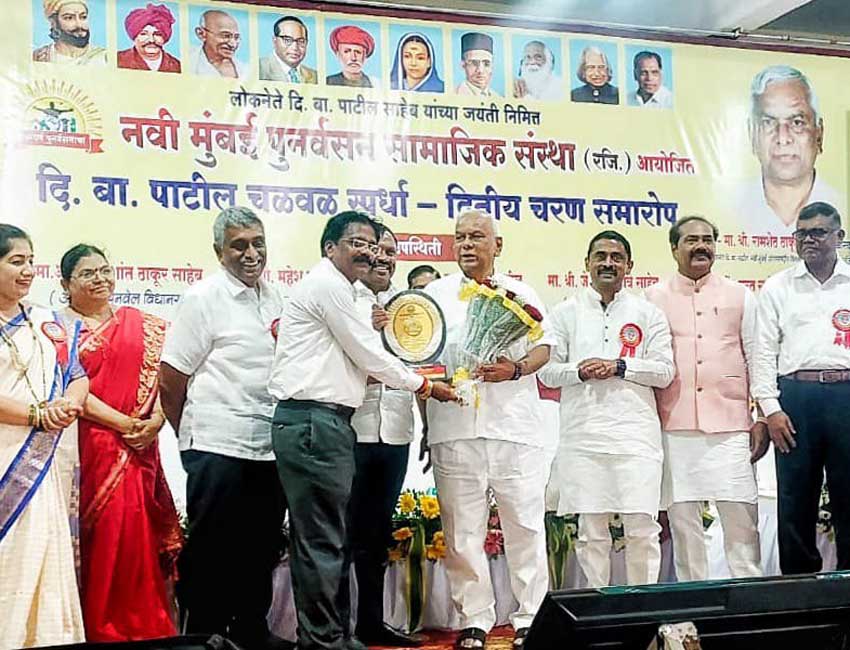 उरण : ‘नवी मुंबई पुनर्वसन सामाजिक संस्था'चे अध्यक्ष दशरथ भगत यांच्या पुढाकाराने दि. बा. पाटील यांचे त्याग आणि विचारांचे आंदोलन, साहित्य आणि कलेच्या माध्यमातून सतत तेवत ठेवण्यासाठी आयोजित केलेल्या ‘दि. बा. पाटील स्फूर्तीस्थान' या चळवळ स्पर्धेच्या द्वितीय चरणातील विजेत्या स्पर्धकांचा गुणगौरव समारंभ आणि या चळवळ स्पर्धेत सहभागी झालेल्या विविध शैक्षणिक संस्थांमधील समर्पित शिक्षकांचा सन्मान माजी खासदार रामशेठ ठाकूर यांच्या प्रमुख उपस्थितीत मोठ्या उत्साही वातावरणात ‘दिबां'चे जन्मगाव जासई येथे पार पडला.