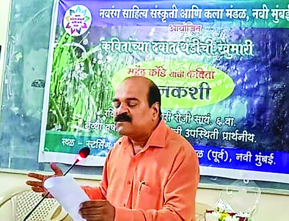 नवी मुंबई : नवरंग साहित्य संस्कृती आणि कला - नवी मुंबई या मंडळातर्फे नवी मुंबई महानगरपालिका जनसंपर्क अधिकारी, निवेदक लेखक आणि कवी महेंद्र कोंडे यांचा ‘कविता बावनकशी' हा एकपात्री कविता सादरीकरणाचा कार्यक्रम १४ जानेवारी रोजी स्टर्लिंग कॉलेज, नेरुळ-सीवूड्स येथे संपन्न झाला. याप्रसंगी ज्येष्ठ आध्यात्मिक अभ्यासक आणि लेखक ह. भ. प. देविदास पोटे तसेच साहित्य आणि कला क्षेत्रातील मान्यवर डॉ. ह. भ. प. देवीदास पोटे, डॉ. प्रा. अजित मगदूम, वृषाली मगदूम, आप्पा ठाकूर, ललित पाठक, साहेबराव ठाणगे, डॉ. अशोक पाटील, अशोक पालवे, प्रा. रविंद्र पाटील, वैभव वऱ्हाडी, प्रसाद माळी, पत्रकार अनिलकुमार उबाळे, राजेंद्र बनसोडे, कृष्णांत संकपाळ आदि उपस्थित होते.