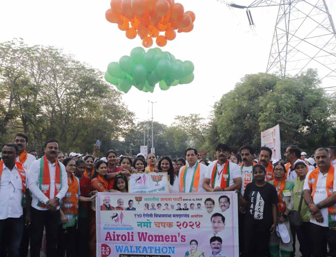 नवी मुंबई : नमो चषक 2024 अंतर्गत 150, ऐरोली विधानसभा मतदारसंघाच्या वतीने आयोजित वुमन्स वॉकेथॉनला उत्स्फूर्त प्रतिसाद लाभला. ऐरोलीमधील हजारो महिलांनी वॉकेथॉनमध्ये उत्साही सहभाग नोंदवून निरोगी आयुष्यासाठी खेळ खेळण्याचा संदेश दिला.