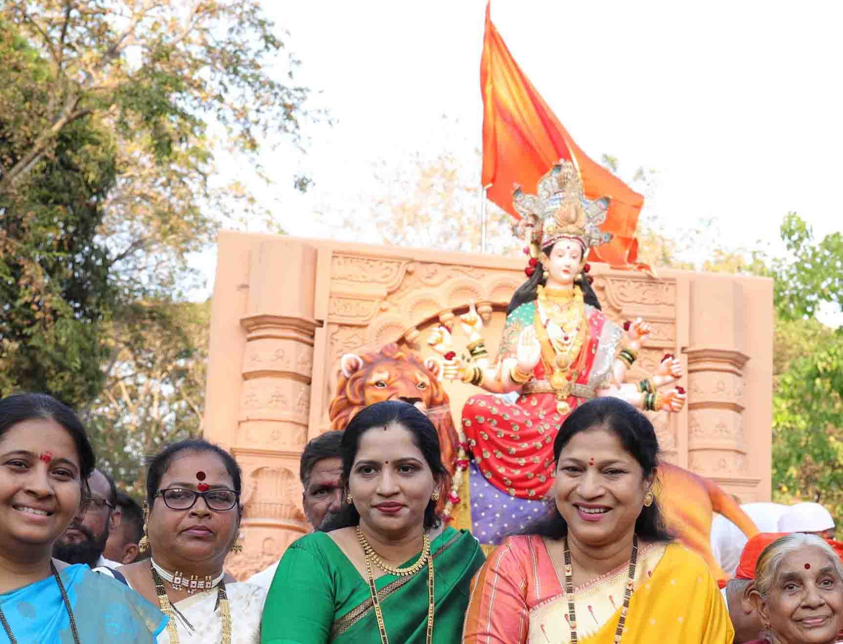 ठाणे : ‘आनंद चॅरिटेबल ट्रस्ट'च्या वतीने आयोजित होत असलेल्या जांभळी नाका येथील श्री छत्रपती शिवाजी महाराज मैदान येथे गुढीपाडवा आणि नुतन वर्षाच्या प्रारंभी देवीचे आगमन मोठ्या जल्लोषात करण्यात आले. या मिरवणुकीत देवीच्या आगमनासाठी ३०० हुन अधिक पथक तसेच संपूर्ण ठाणे जिल्ह्यातून वारकरी सांप्रदायाचे वारकरी पथके, झांज पथक, बँड पथक, दांडपट्टा, महिलांचे आणि पुरुषांचे लेझीम पथक, घोडेस्वार, मावळे, तुळशी वृंदावन डोक्यावर घेऊन चालणाऱ्या महिला, आदि देवीच्या स्वागतासाठी सामील झाले होते.