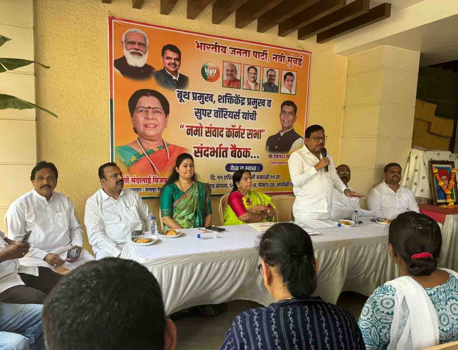 सीबीडी : लोकसभा निवडणुकीच्या अनुषंगाने छोट्या छोट्या कॉर्नर सभांच्या माध्यमातून जनतेशी संवाद साधला जावा याकरिता ‘भाजपा'चे प्रदेशाध्यक्ष चंद्रशेखर बावनकुळे यांच्या आदेशानुसार ‘नमो संवाद कॉर्नर सभा' आयोजित करण्याचे आदेश देण्यात आले होते. त्याच अनुषंगाने १५१-बेलापूर विधानसभा क्षेत्रामध्ये आमदार सौ. मंदाताई म्हात्रे यांच्या अध्यक्षतेखाली त्यांच्या निवासस्थानी ‘नमो संवाद कॉर्नर सभा' संदर्भात रुपरेषा ठरविण्याकरिता भाजपा सुपर वारीयर्स, बुथ प्रमुख, शक्तीकेंद्र प्रमुख यांची ११ एप्रिल रोजी बैठक संपन्न झाली.