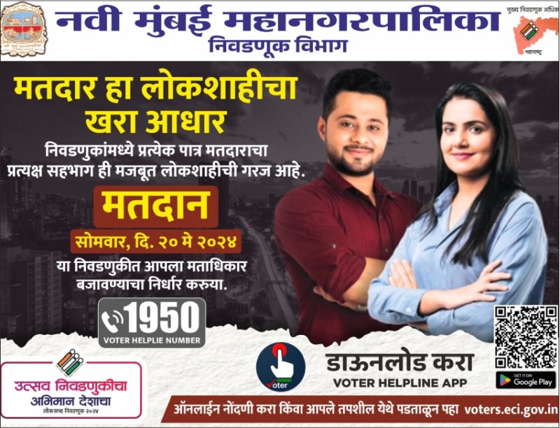 नवी मुंबई : ‘लोकसभा निवडणूक-२०२४'करिता ‘२५-ठाणे लोकसभा मतदारसंघ'मध्ये २० मे रोजी मतदान होत असून जास्तीत जास्त मतदारांनी आपला मतदानाचा हक्क बजावावा याकरिता नवी मुंबई महापालिका आयुक्त डॉ. कैलास शिंदे यांच्या मार्गदर्शनाखाली स्वीप कार्यक्रमांतर्गत विविध प्रसार माध्यमांचा आणि साधनांचा वापर करुन मोठ्या प्रमाणावर जनजागृती अभियान राबविण्यात आले आहे.